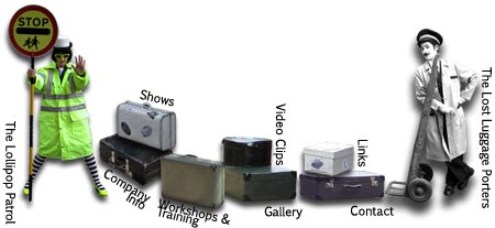 Find out more about The Lollipop Patrol See details of Curious Cargo Shows Find out more about The Lollipop Patrol Find out more about Curious Cargo Shows What is Curious Cargo? Find out more about our workshops and training See video footage of performances Curious Cargo in action You are here! Getting in touch with Curious Cargo Find out more about the Lost Luggage Porters